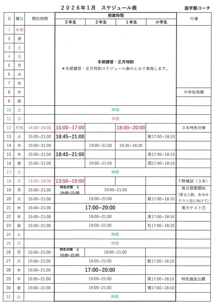 *毎日授業の日程や開校時間など、スケジュール表をご参考ください。