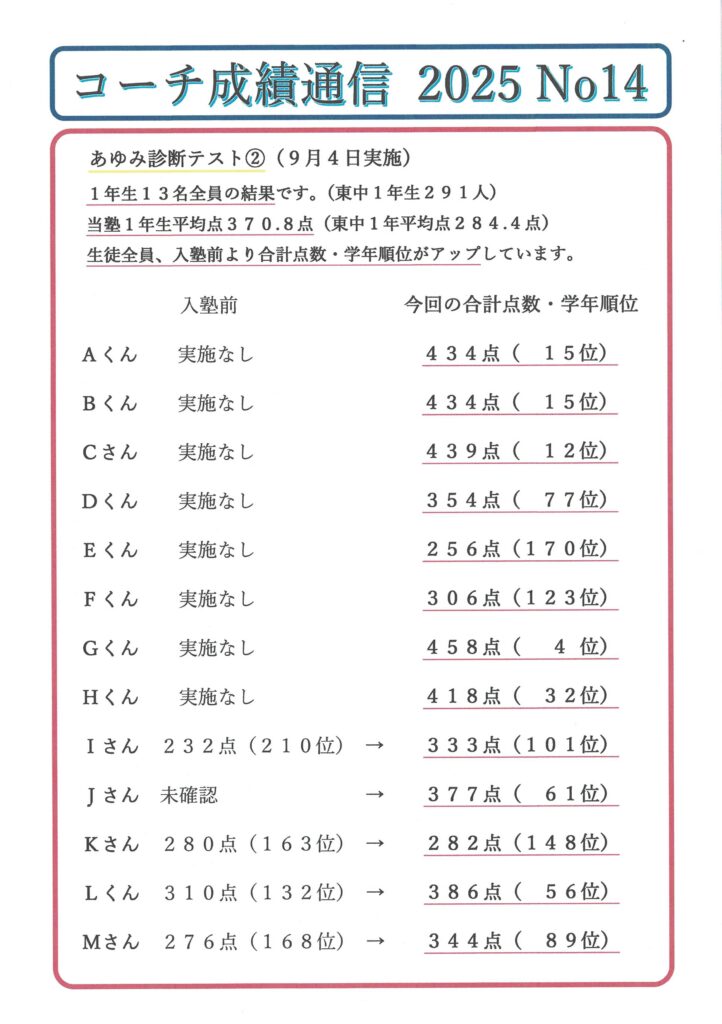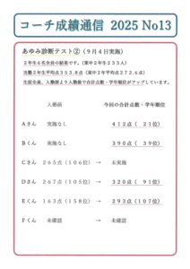 あゆみ診断テスト②(1年生) 2025年9月30日 最終更新日時 : 2025年10月3日 コーチ あゆみ診断テスト②、1年生13名全員の結果です。生徒は、テスト3週間前から「毎日授業」で努力しました。