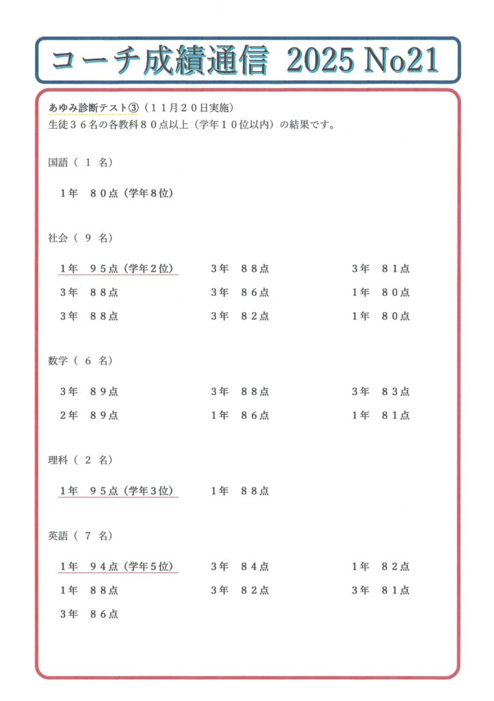 あゆみ診断テスト③(各教科) 2026年1月5日 最終更新日時 : 2026年1月6日 コーチ あゆみ診断テスト③、生徒36名の各教科80点以上(学年10位以内)の結果です。生徒は、テスト3週間前から「毎日授業」で努力しました。