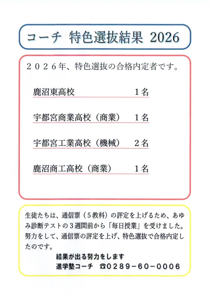 特色選抜結果(2026年) 2026年2月13日 最終更新日時 : 2026年2月13日 コーチ 2026年、特色選抜の合格内定者です❕生徒たちは、通信票の評定(5教科)を上げるため、あゆみ診断テストの3週間前から「毎日授業」を受けました。努力して、通信票の評定を上げ、特色選抜で合格内定したのです。