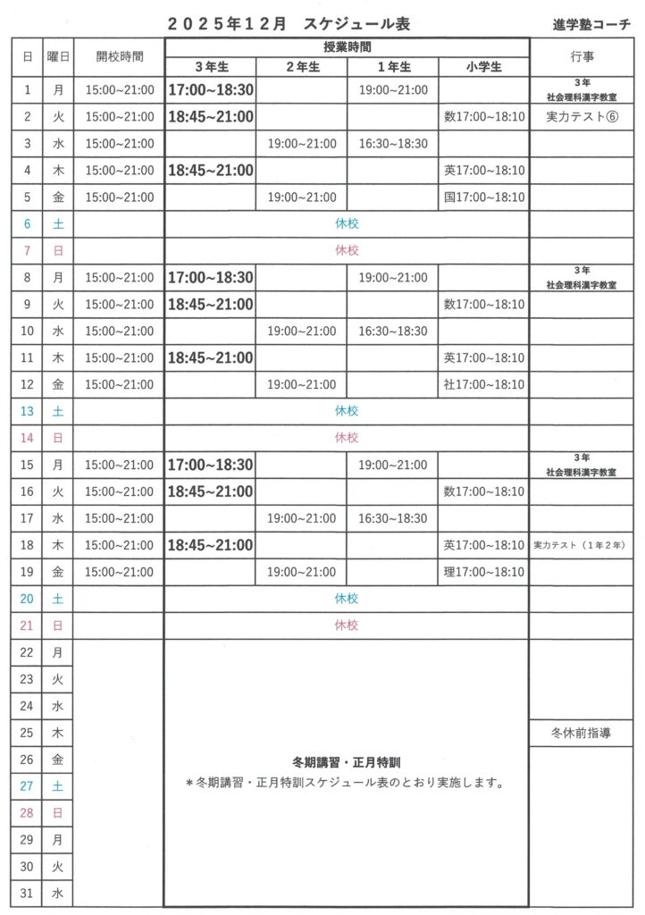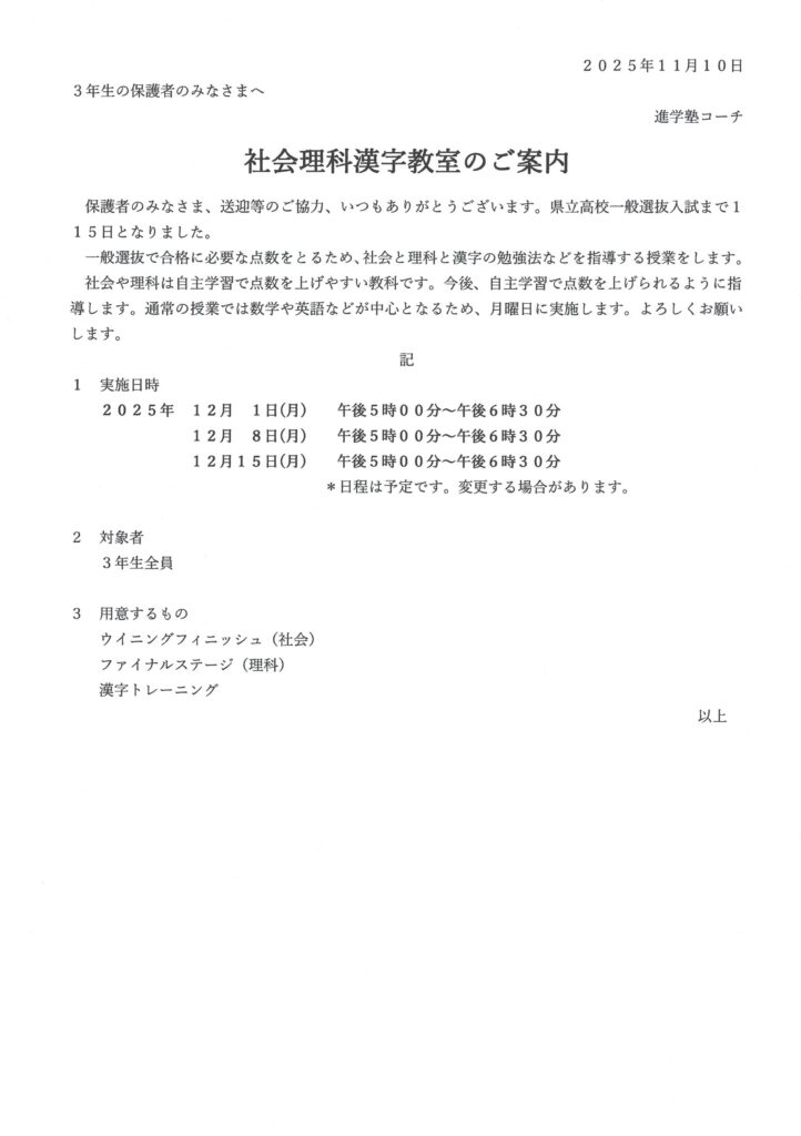 社会理科漢字教室❕ 2025年11月13日 最終更新日時 : 2025年11月14日 コーチ 12月1日・8日・15日の月曜日、一般選抜で合格に必要な点数をとるため、社会と理科と漢字の勉強法などを指導する授業を実施します❕体験授業(無料、1~2週間)を受付中です。