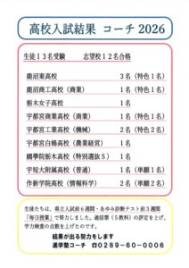 高校入試結果(過去6年間2026年~2021年) 2026年3月12日 最終更新日時 : 2026年3月12日 コーチ 過去6年間(2026年~2021年)の高校入試の結果です❕生徒たちは、県立入試の6週間前・あゆみ診断テストの3週間前から「毎日授業」で努力しました。通信票(5教科)の評定と学力検査の点数を上げたのです。