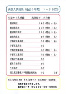 高校入試結果(2026年) 2026年3月11日 最終更新日時 : 2026年3月11日 コーチ 2026年、高校入試の結果です❕生徒たちは、県立入試の6週間前・あゆみ診断テストの3週間前から「毎日授業」で努力しました。通信票(5教科)の評定と学力検査の点数を上げたのです。