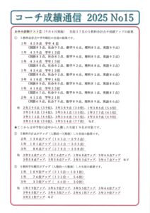 12月22日から1月9日まで「冬期講習」を実施します❕3年生は高校入試対策です。さらに、12月28日から1月3日まで「正月特訓」があります。2年生・1年生は、3学期(あゆみ診断テスト④)に向けて、先どりで勉強します。5教 […]