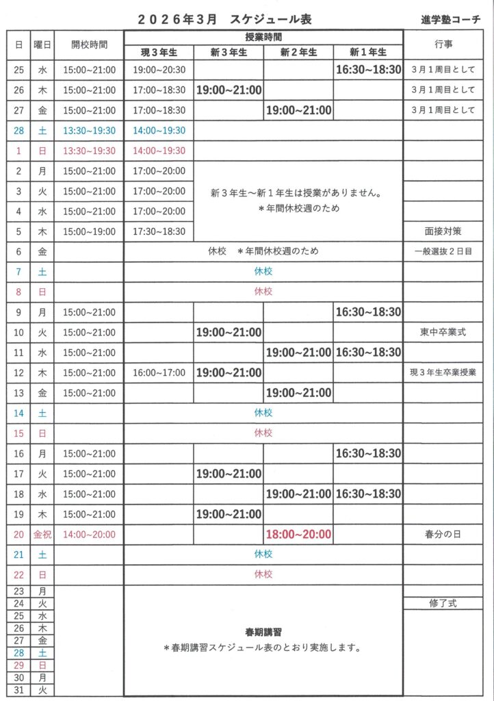 *毎日授業の日程や開校時間など、スケジュール表をご参考ください。